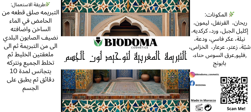 دلّلي بشرتك مع التبريمة المغربية لتوحيد اللون — منتوج طبيعي أصيل يمنحك بشرة موحّدة اللون، ناعمة، ومشرقة بطابع مغربي تقليدي 🌿✨