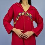 تميزي بإطلالة تخطف الأنظار مع هاد الجلابة الفريدة، المصنوعة من قماش خفيف وانسيابي باللون الأحمر الملكي، ومزينة بتطريز يدوي فاخر عند الصدر بألوان ذهبية وزرقاء تعكس الأناقة والرقي. تفاصيل الخيوط اللامعة تزيد من الفخامة وتجعل منها قطعة مثالية للمناسبات الراقية