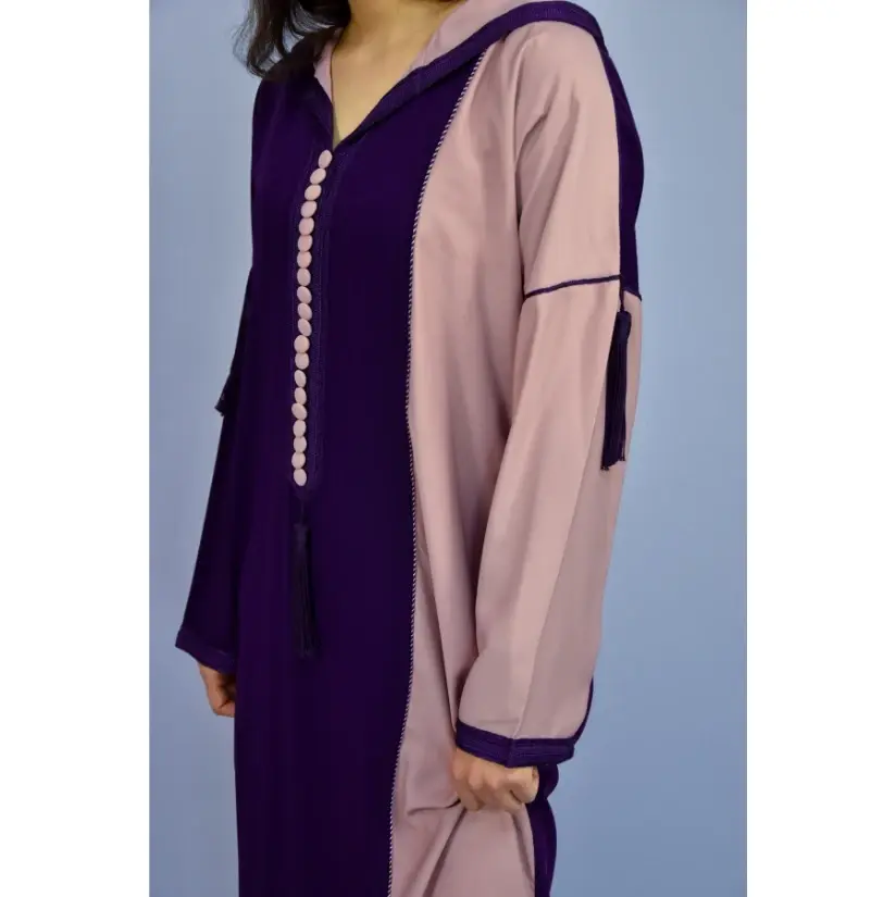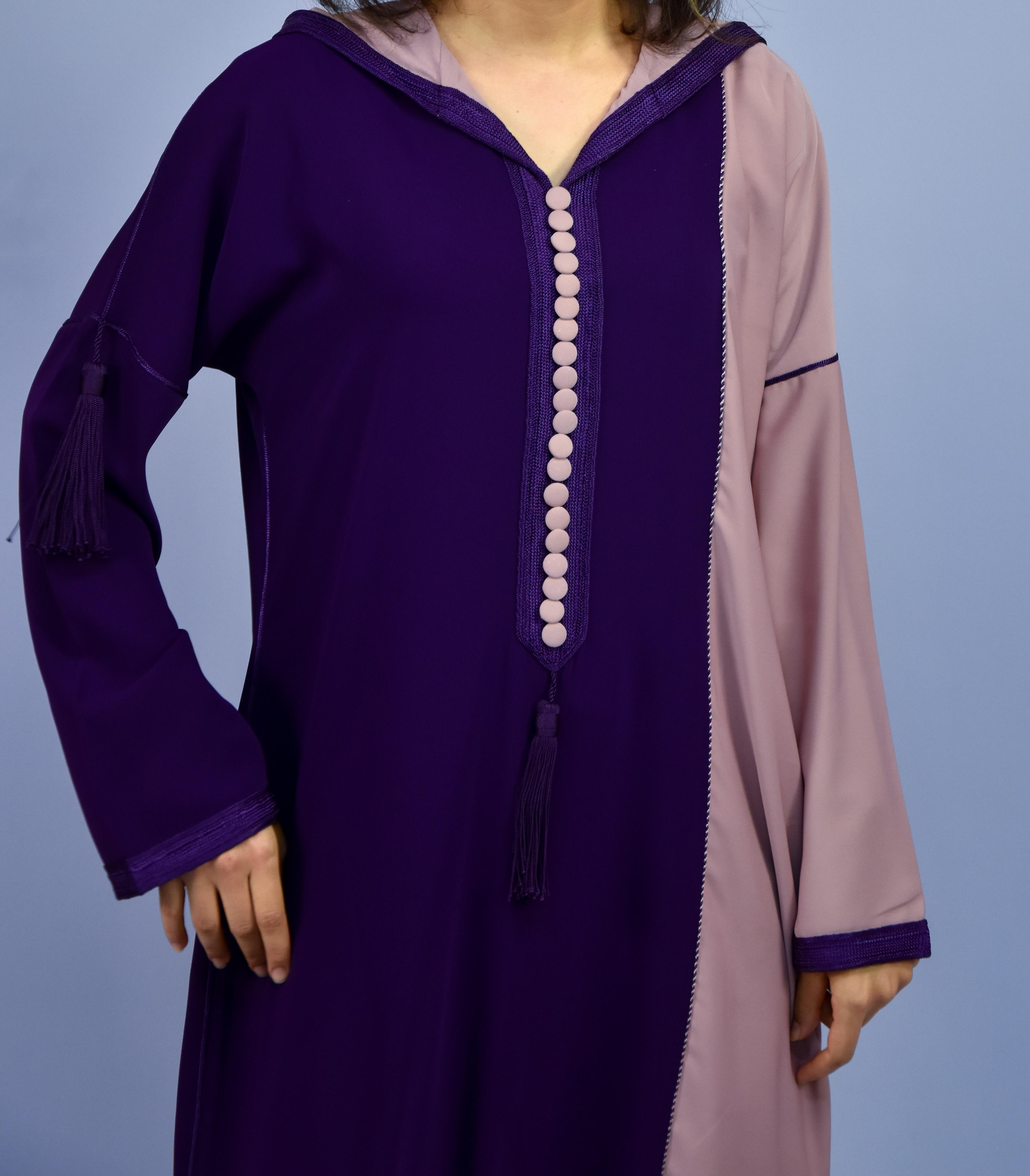 إذا كنتي كتحلمي بإطلالة تجمع بين الأناقة والرقة، فهاد الجلابة بالكريب هي الاختيار المثالي! تصميمها العصري كيزاوج بين البنفسجي الملكي والوردي البودري فانسجام رائع، مزينة بصف أزرار أنيق فالأمام، مع لمسة الشراشيف الناعمة فالأكمام لي كتعطيها جمالية فريدة