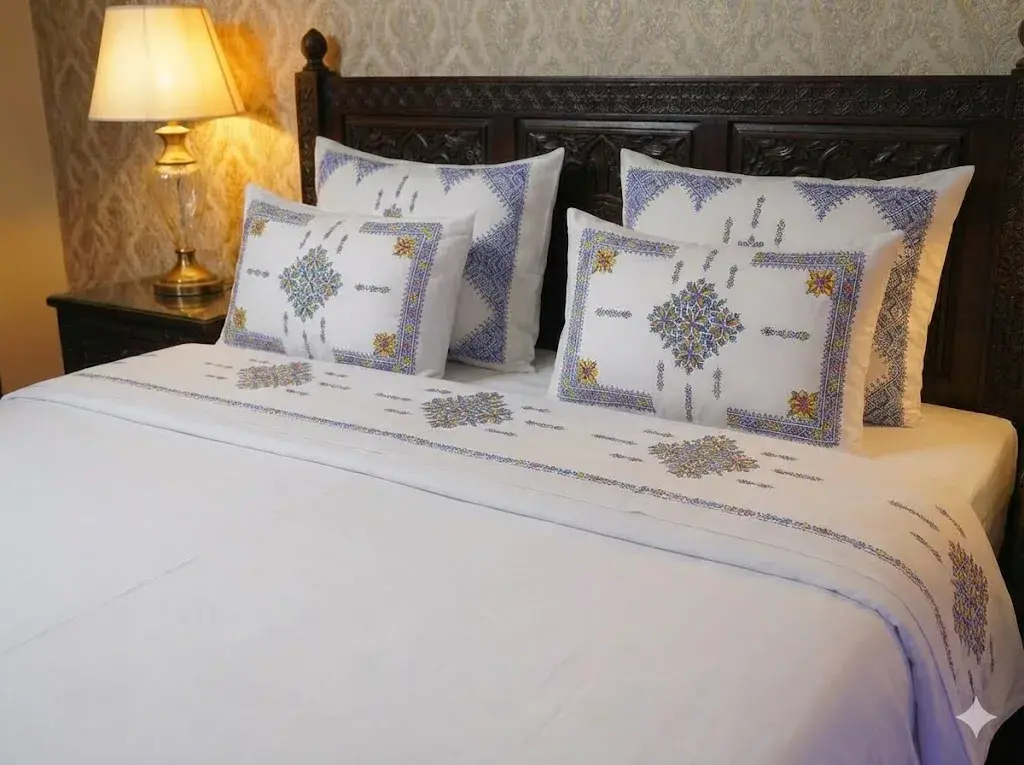 واش كتقلبي على القطعة اللي غادي تخطف العين فبيت النعاس ديالك؟ أو كتوجد "الجهاز" وبغيتي شي حاجة دايزها الكلام؟ كنقدمو ليكم هاد التحفة الفنية: “غطاء سرير”، كيجمع بين رقي الطرز التقليدي ونعومة الثوب الفاخر. قطعة كتعطي للسرير هيبة وجمالية لا توصف.